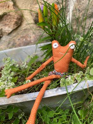 Lilifrog est espiègle (vraiment !). Elle a le corps souple et est facilement maniable par les tout petits grâce à ses longues jambes et ses longs bras. Finie, elle fait 40 cm de haut. Elle se contorsionne et se case partout.