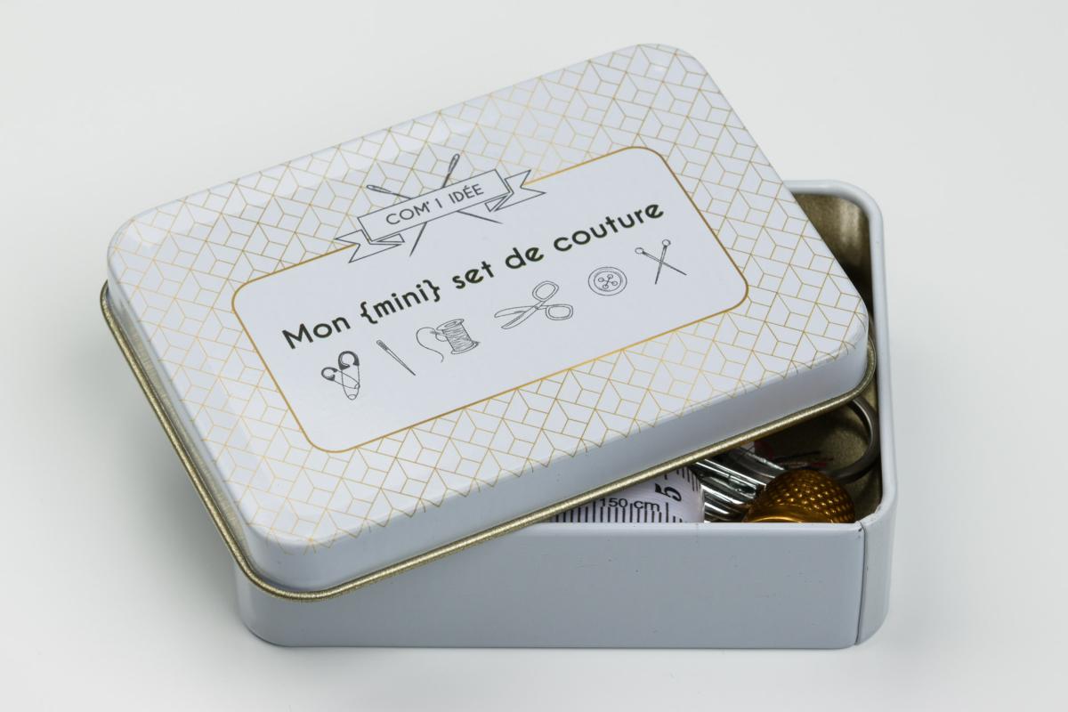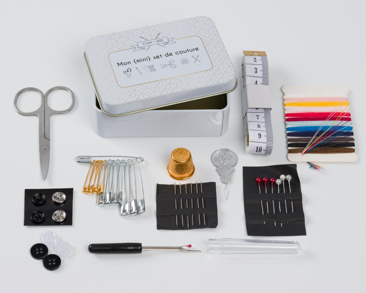 Présenté dans une jolie boite en fer, ce set contient les indispensables pour une couture nomade :